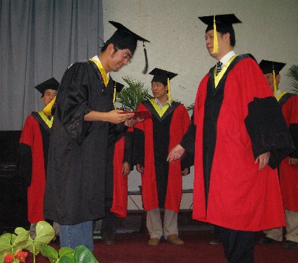随后,在十三号楼报告厅举行了“航空宇航学院2005届毕业生毕业证书、学位证书颁发仪式”,院长许希武教授为大家颁发了证书,与航宇学子共同见证了他们学业的圆满完成。仪式井然有序地进行,身穿工学学士服的毕业生们手捧双证书,脸上露出满足的微笑。