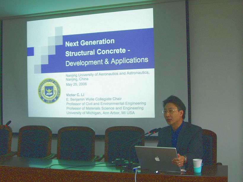 2006年5月25日上午,美国密西根大学土木工程系Victor C Li 教授在航空宇航学院学术报告厅,为我院师生做了题为“Next Generation Structural Concrete--Development and Applications”的精彩的学术报告。报告内容新颖、丰富,阐述了工程水泥基复合材料(ECC)的基本力学行为、设计方法和工程应用的研究现状和最新发展方向。这次讲座将对我院该领域的研究起到了推动和借鉴作用。报告引起了与会师生的浓厚兴趣,师生们就某些前沿问题与教授进行了热烈的讨论。土木工程系主任余红发教授主持了会议,航空宇航学院师生百余人参加了报告会。