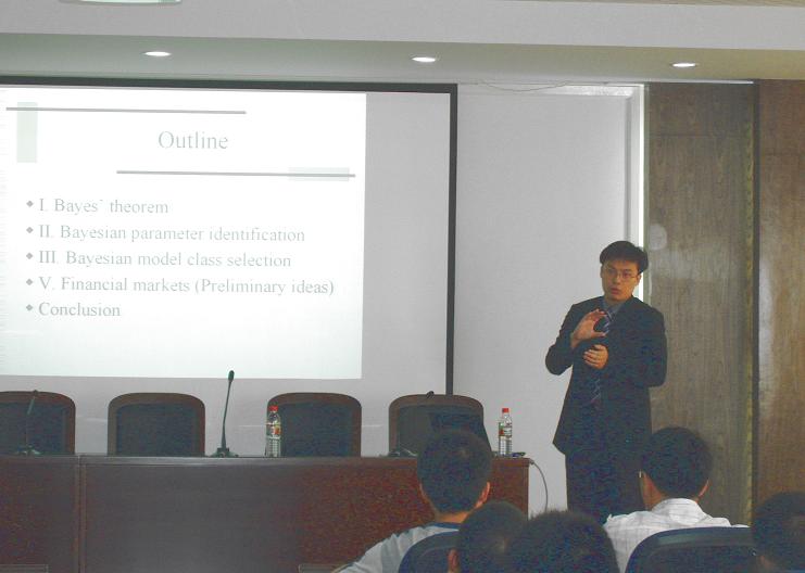 该报告对贝业斯方法做了深入浅出的介绍,从经典贝叶斯公式,到贝叶斯方法作为一种反问题求解框架在结构健康评估参数辨识中的应用,以及在金融中应用的设想做了生动的讲述,其中大部分是他本人的创新性的工作。报告引起了与会师生的浓厚兴趣,师生们就某些前沿问题与Kelvin Yuen副教授进行了热烈的讨论。Kelvin Yuen副教授在宁期间还与学院部分教师和研究生在热烈的气氛中,进行了学术座谈。会后Kelvin Yuen副教授还参观了高速风洞试验室等。
