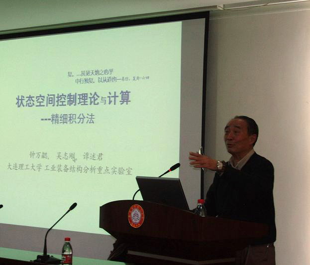 2007年4月14日下午,在航空宇航学院学术报告厅,中国科学院院士、著名工程力学与计算力学家钟万勰教授,为我院师生作了题为“状态空间控制理论与计算―精细积分”的精彩学术报告。之后,钟万勰院士的谭述君博士及助手吴志刚教授,分别作了“基于精细积分的最优控制系统程序包PIM-CSD”及“应用精细积分方法求解卫星编队重构控制问题”的报告。航空宇航学院院长许希武教授主持了报告会,全校近两百名师生参加了报告会。