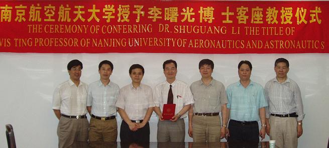 2007年6月1日下午,在航空宇航学院会议室,英国曼彻斯特大学高级讲师李曙光博士受聘为我校客座教授。国际合作与交流处金泉元处长主持了受聘仪式。聂宏副校长致词,并代表学校向李曙光博士颁发了客座教授聘书、校徽。中国航空工业第二集团公司副总经理史坚忠出席了授聘仪式并讲话。参加受聘仪式的还有中国航空工业第二集团公司颜东研究员、校长助理、航空宇航学院院长许希武教授及航空宇航学院结构强度研究所师生近三十余人。