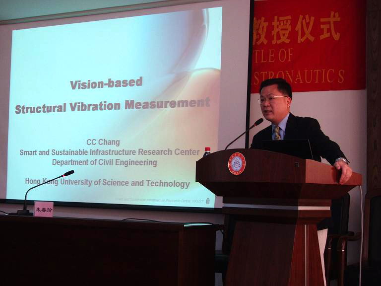 仪式结束后,张志成教授作了题为“Vision-based Structural Vibration Measurement”的精彩学术报告。报告内容新颖、丰富、生动,阐明影像显示技术的最新发展方向。张志成教授结合自己多年的研究成果,讲述了影像测量方法中需注意的若干问题以及今后的研究方向。这些技术资料对解决我校在振动测试、系统辨识与损伤诊断研究方面所遇到的技术难题有很大的帮助,对我校今后的相关研究很有借鉴推动作用。航空宇航学院结构强度研究所周丽教授主持了报告会。全校师生百余人参加了报告会。