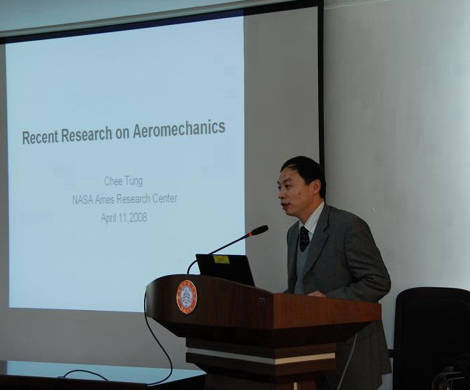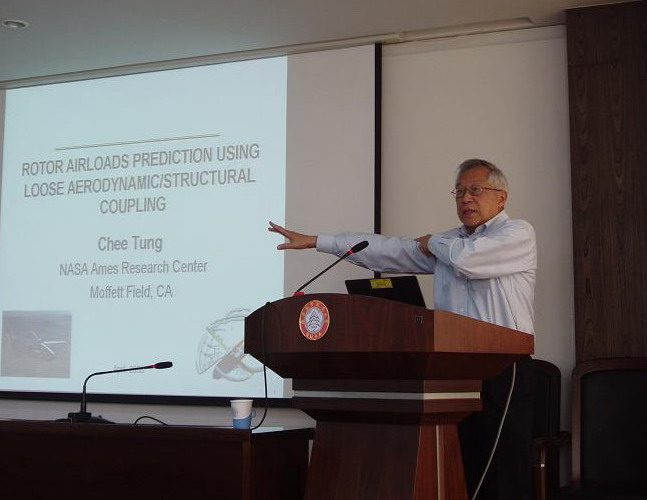 Chee Tung博士在我校访问期间,与直升机旋翼动力学国防科技重点实验室的老师和研究生进行了深入的学术交流,对师生科研中存在的问题给予了深入的探讨和指导,对直升机技术领域的一些前沿课题作了广泛的介绍,使师生们受到了非常大的启发,为正确把握科研方向起到了重要的作用。Chee Tung博士还多次给予了Smart-Copter毕业设计团队的技术指导,与学生们直接讨论毕设中的一些技术问题。除白天工作外,还经常在晚上坚持工作,为学生们答疑,在学生食堂就餐。Chee Tung博士严谨的科学作风、勤奋的工作作风、朴实的生活作风给大家留下了深刻而美好的印象。访问期间,Chee Tung博士还在航空宇航学院学术报告厅给我校师生作了两场学术报告,分别是 “Recent Research on Aeromechanics”和“CFD/CSD Coupling Techniques”,详细介绍了直升机旋翼动力学方面的最新进展和美国NASA Ames研究中心在这些方面的最新科研成果。