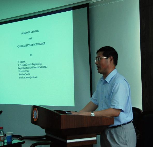 Pol D. Spanos教授,美国工程院院士,著名国际结构动力学专家。1976年美国加州理工学院获得应用力学博士学位,1988年至今任莱斯大学(Rice University)机械工程和土木工程的L.B. Ryon讲座教授。分别于1990年和1991年当选美国机械工程师学会和土木工程师学会会员,1994年当选美国力学学会会员,1999年当选美国Alexander von Humboldt协会终生会员,2003年当选希腊国家科学院通讯院士,2005年当选美国工程院院士。现任国际著名SCI期刊International Journal of Non-Linear Mechanics和Probabilistic Engineering Mechanics主编。编写了18本著作、论文集;发表300余篇学术论文,其中SCI收录130余篇。主要研究方向为多种载荷作用下结构的动力行为与可靠性预测、性能与安全评估、数字信号处理、参数识别等,研究领域涉及结构工程、地震工程、航空航天工程、海洋工程、石油工程、生物医学工程等。