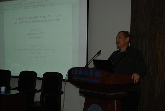 汤教授为我校师生就气动弹性理论作了四场专题学术报告. 首场报告于2月24日下午16:00时在航空宇航学院报告厅举行,航空宇航学院院长赵宁教授主持了报告会。报告会内容引起了我校广大师生的浓厚兴趣,报告厅座无虚席,许多老师和同学都坐在临时的活动椅子上,全校师生近200人参加了报告会。在2月25日、26日,3月3日于振动工程研究所会议室举行的三场报告同样受到了全校师生的热情参与,由于会场较小,少数同学站着听完报告。系列报告涉及气动弹性领域的理论方法、实验研究和数值模拟等多方面,与会师生就相关问题与汤教授进行了热烈的讨论。