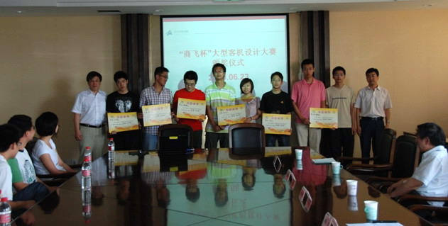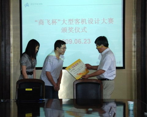2009年6月23日上午,航空宇航学院在明故宫校区18―511举行了“商飞杯”大型客机设计大赛的颁奖仪式,对参加大赛并获奖的作者进行表彰。会议由航空宇航学院胡挺老师主持,校科技部部长熊克教授,,航空宇航学院党委书记李明成,院党委副书记孙占久,校团委副书记宋凯等领导和30余名获奖选手参加了颁奖仪式。