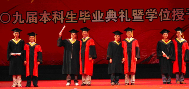 毕业典礼以全体起立奏国歌开始,接着,李明成书记宣读毕业生表彰决定;赵宁院长宣读毕业生名单,颁发毕业证书。毕业留念DV的播放使同学们感怀起大学生活的点点滴滴;当10位“我最难忘的老师”代表依次走上主席台时,全场沸腾起来,毕业生同学纷纷前去献花;教师代表的临别赠言传递着嘱托,毕业生代表的发言洋溢着对未来的憧憬;吴校长的寄语使毕业典礼达到了高潮。毕业典礼以全体起立奏校歌结束。随后,赵宁院长、李明成书记、黄卫清教授、蒋彦龙教授等为到场的毕业生同学授予学位。