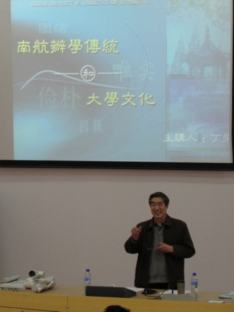 2010年4月26日16:00,航空宇航学院邀请了我校原校党委副书记、原纪委书记、南航现关心下一代工作委员会常务副主任丁荣茂老师在将军路校区2110教室为2009级同学做了一场《南航办学传统和大学文化》专题讲座。