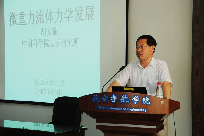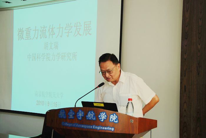 2010年9月15日下午,在航空宇航学院学术报告厅,中国科学院胡文瑞院士为我校师生作了一场题为“微重力流体力学发展”的学术报告,报告会由航空宇航学院院长赵宁教授主持,我校200余名师生有幸聆听胡文瑞院士精彩的报告。报告结束后,胡院士还耐心回答了同学们的相关提问。