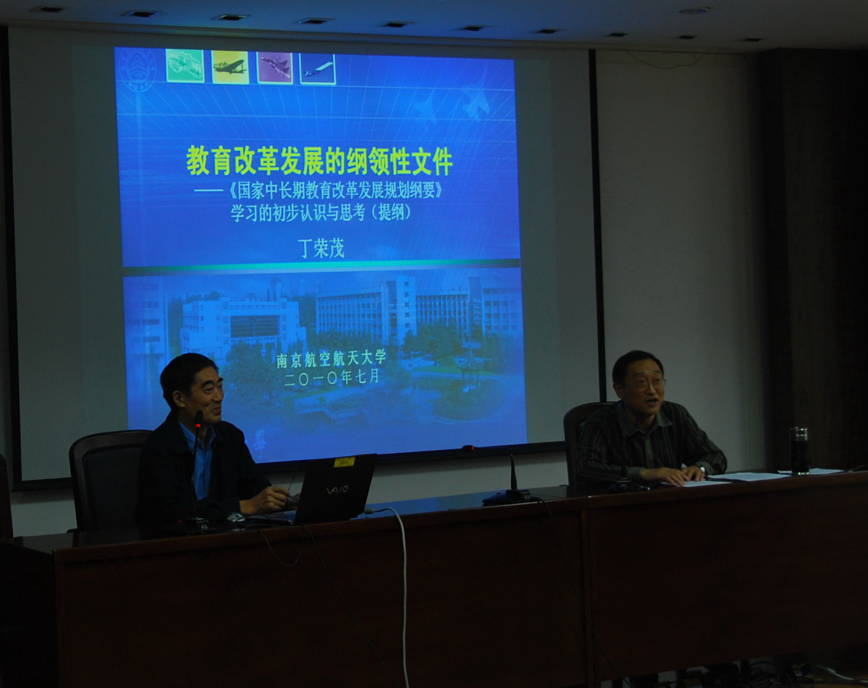 会议最后,学院邀请了原校纪委书记、南航关心下一代工作委员会主任丁荣茂老师为全院教职工做了《教育发展规划纲要》辅导报告。