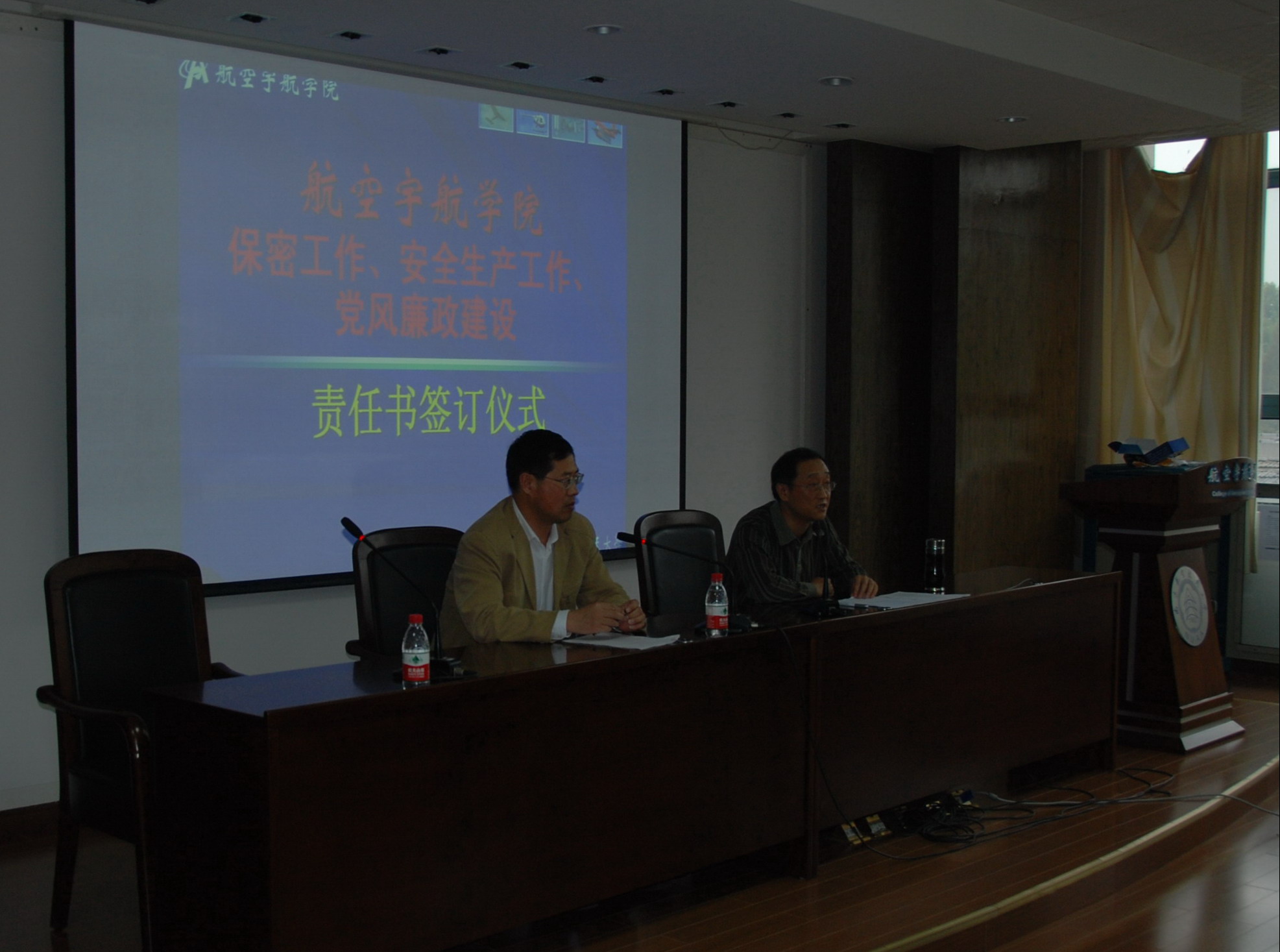 接着,院长赵宁教授宣读了《航空宇航学院保密工作、安全生产、党风廉政建设责任书》内容,李明成书记与赵宁院长代表学院党政领导与系所班子负责人签订了责任书。