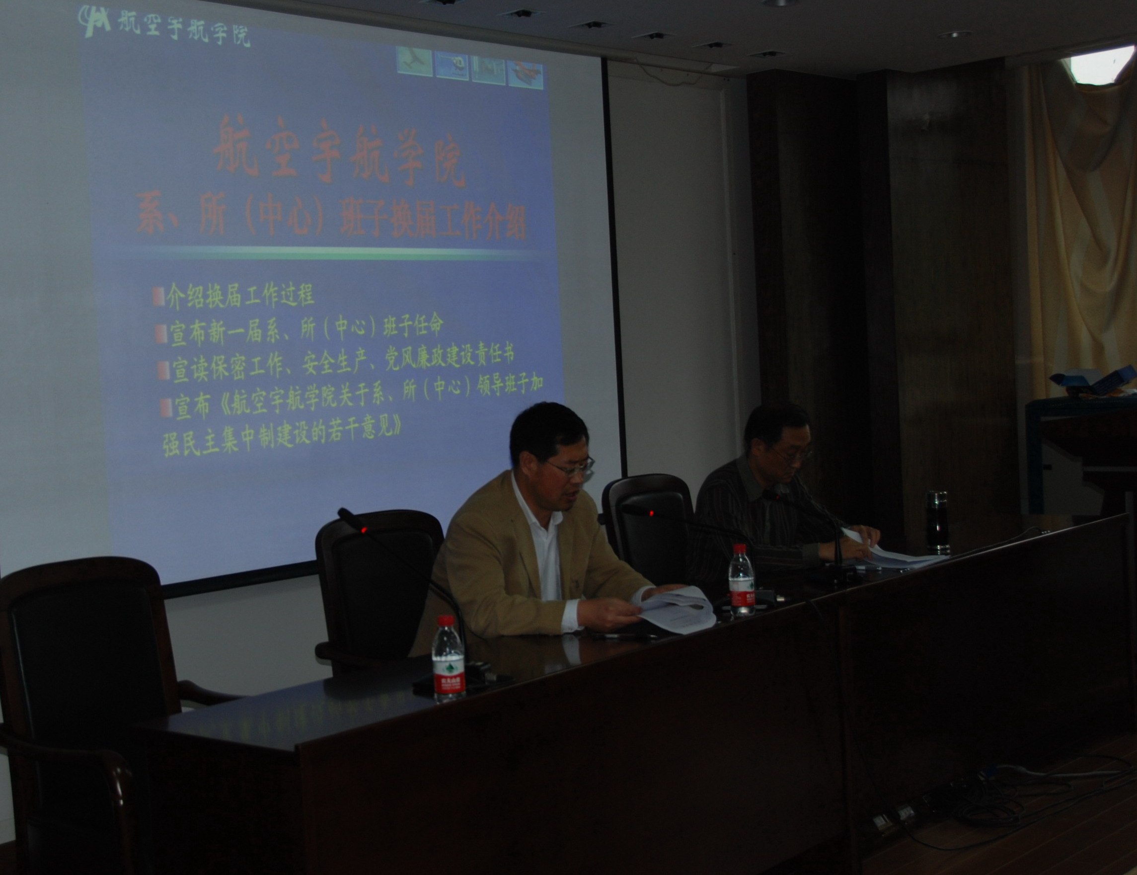 首先李明成书记总结了新一届系所班子换届工作情况,赵宁院长宣读了《关于姚卫星等同志任职的通知》《关于同意空气动力学系成立两个中心的决定》以及《航空宇航学院关于系、所(中心)领导班子加强民主集中制建设的若干意见》,宣告新一届系所班子成立。