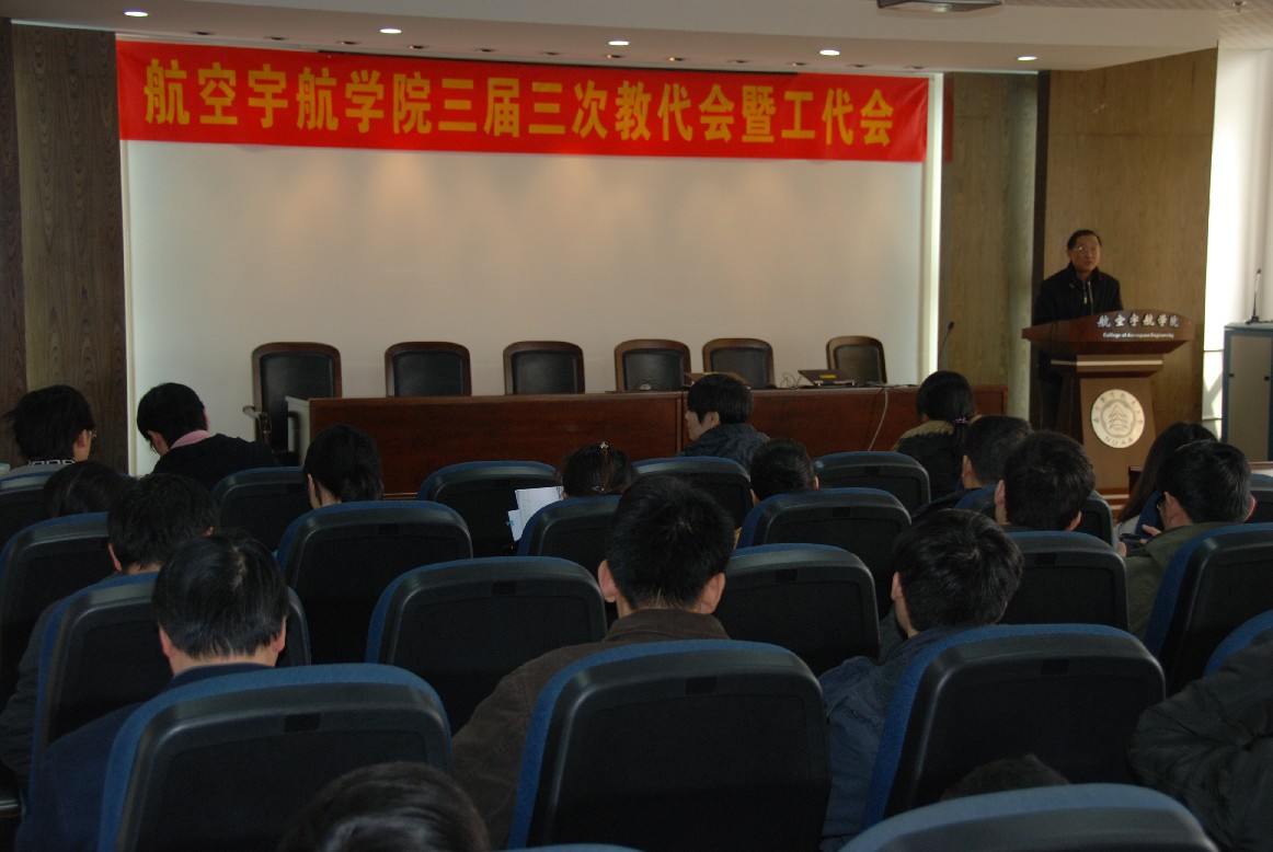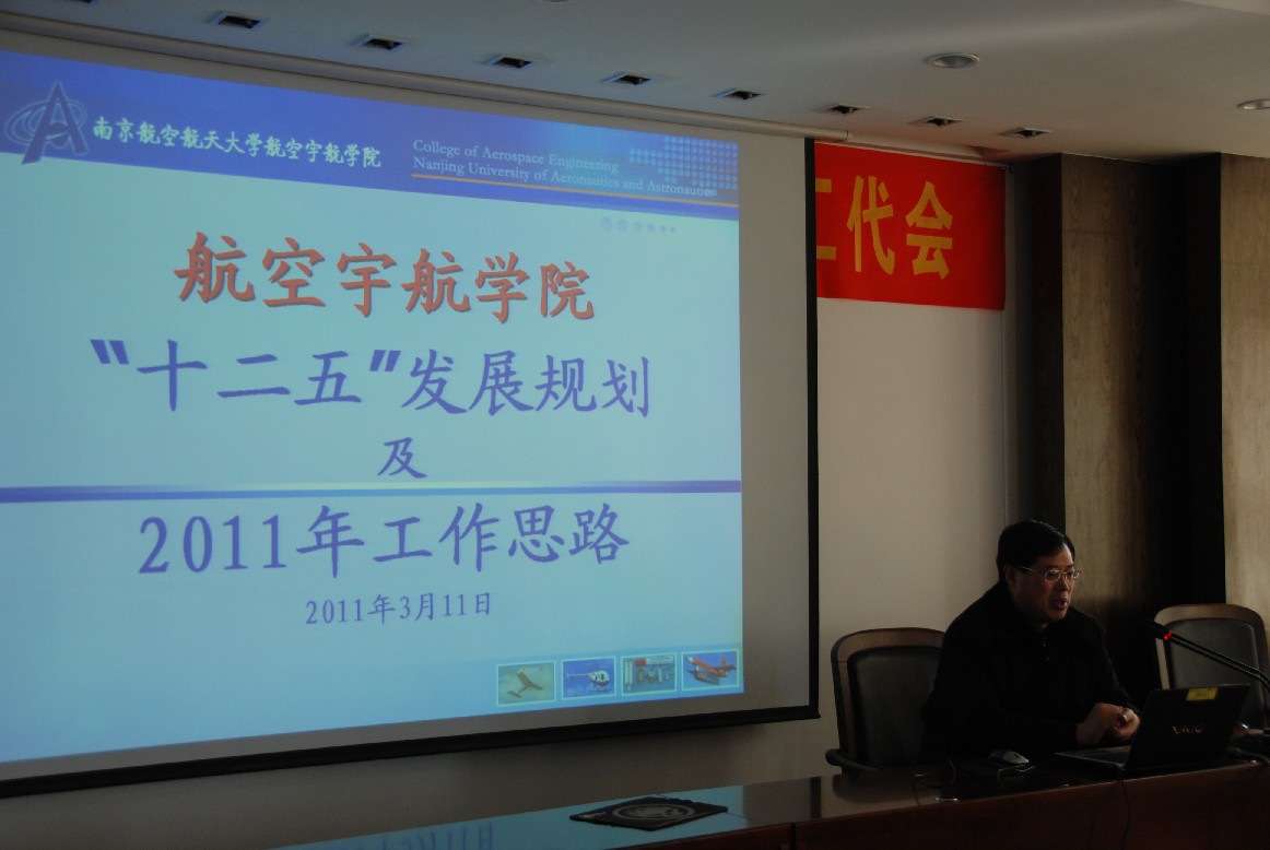 会议由党委书记李明成主持,赵宁院长向全院教职工介绍了学院“十二五”规划思路及2011年工作要点,提出学院“十二五”发展的指导思想是“以国家和社会需求为牵引,以学科建设为主线,以人才培养为根本,以师资队伍建设为核心,以科学研究为强院之路,抢抓机遇、科学发展、凝心聚力、开拓创新,坚持“突出特色,协调发展,勇创一流”,建设具有航空航天特色的一流学院。”,根据指导思想确定了我们的发展定位和发展目标,对于2011年的工作思路从“学科与队伍建设,基地建设,人才培养,科学研究,党建思想政治工作、学院文化建设,学生工作和保密与安全稳定”等七个方面做了阐述。