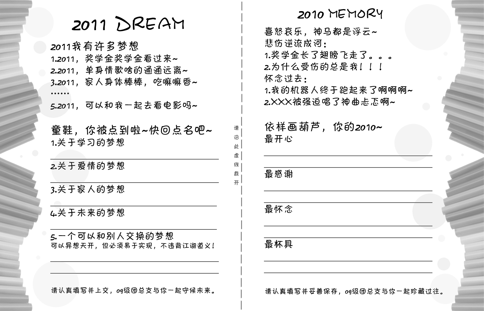 在09级团总支下发的“新年备忘”中,“2010 memory”力求让学生回忆2010年中最开心、最感谢、最怀恋、最杯具……的那些故事,这些故事需要同学们在回忆整理后妥善保存,作为大学中成长的印记。“2011 dream”则希望学生树立关于2011的梦想,关于学习的,关于爱情的,关于家人的,更有关于未来的……最后还将进行“讲出我的2010故事会”和“梦想交流”两个环节,鼓励学生主动表达,展示自我风采。