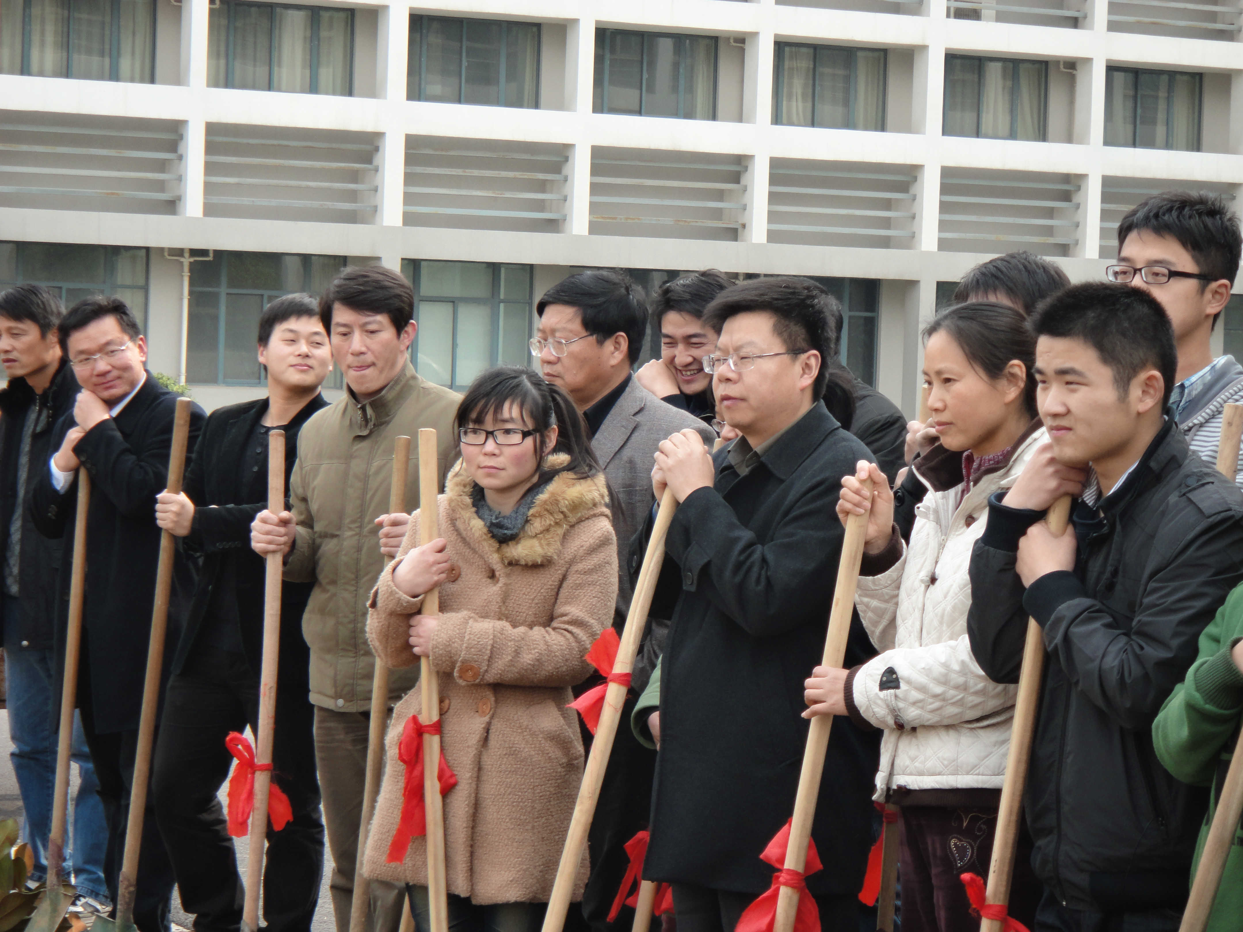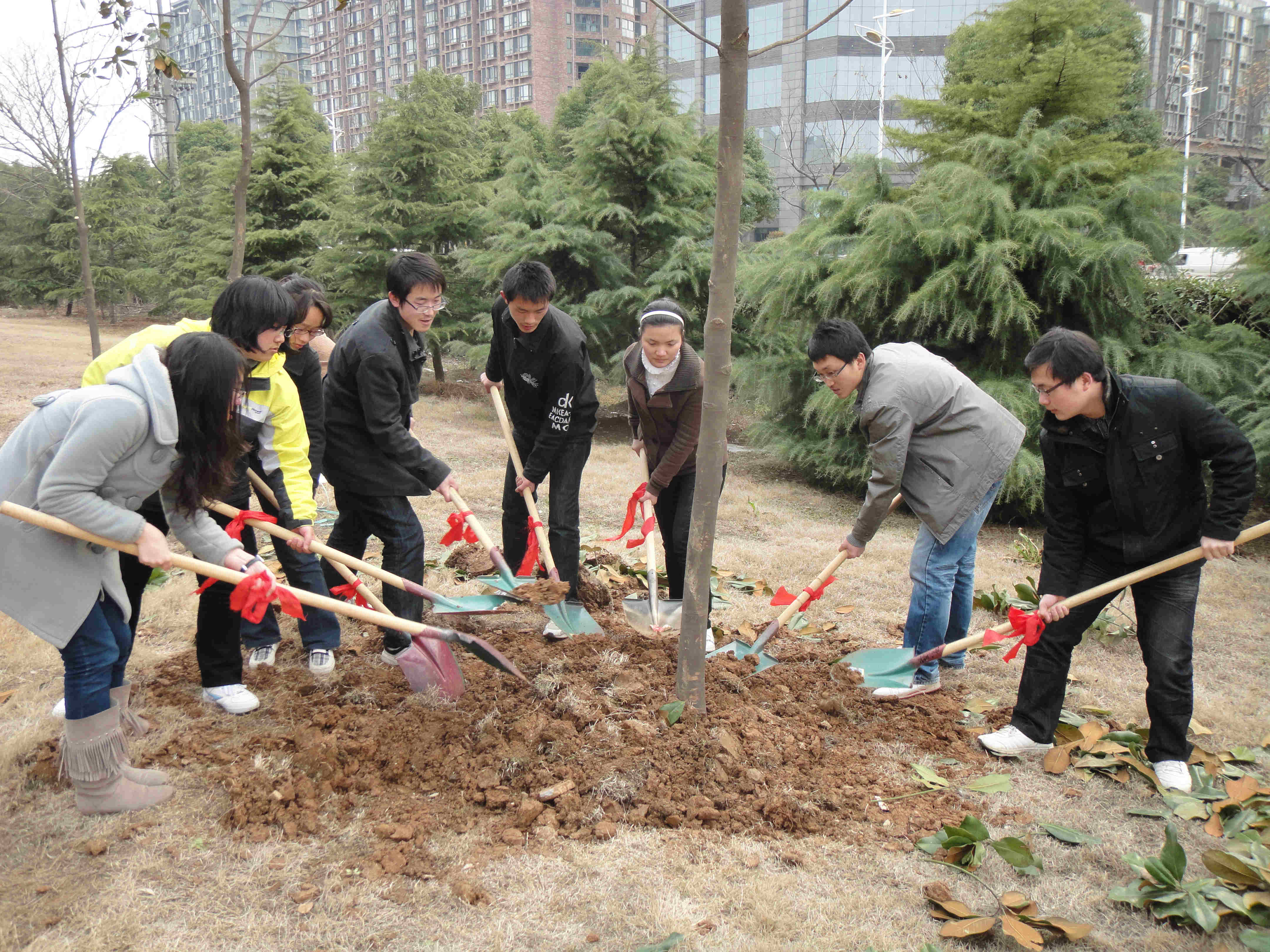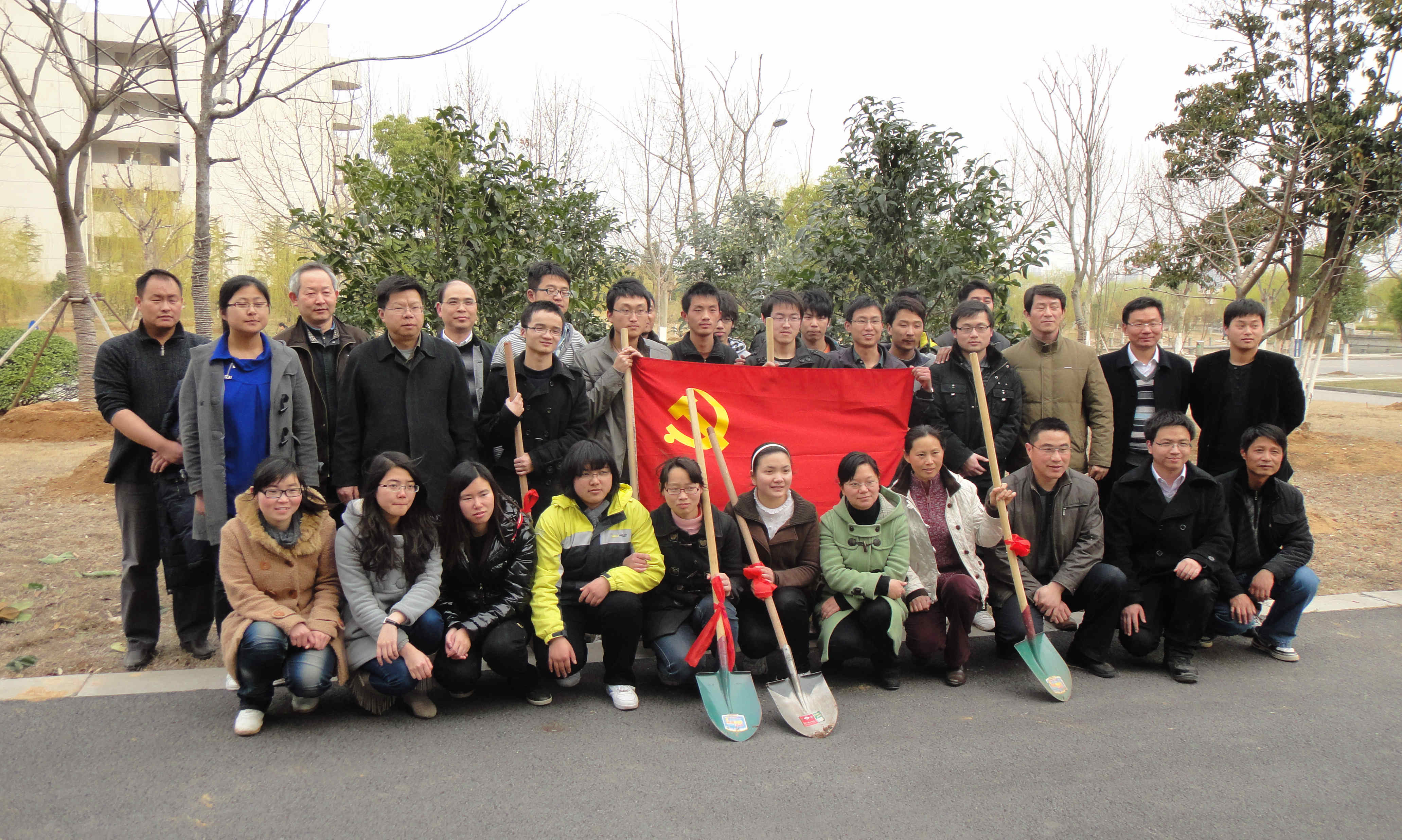 虽然是初春,下午的阳光仍然灼人。师生党员们严格按照技术人员的要求,一丝不苟地劳动。师生们三个一群,两个一组,有的合力将树扶起种下,有的用铁锹费力地铲土,有的提着塑料桶为新种下的树浇水。在党员老师和学生党员的配合下,经过一个多小时的劳动,一棵棵广玉兰拔地而起。最后,在党员老师和学生党员欢声笑语的的合影中结束了这次党建植树活动。