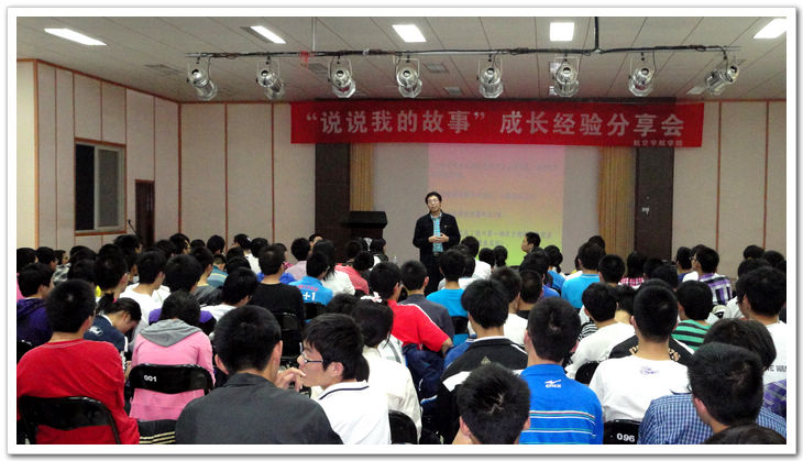 5月26日下午,航空宇航学院在将军路校区艺术中心多功能厅举行“说说我的故事”成长经验分享会。本次活动邀请了众多校园达人与航空宇航学院2010级本科生一起分享大学学习生活中的经历与感悟。