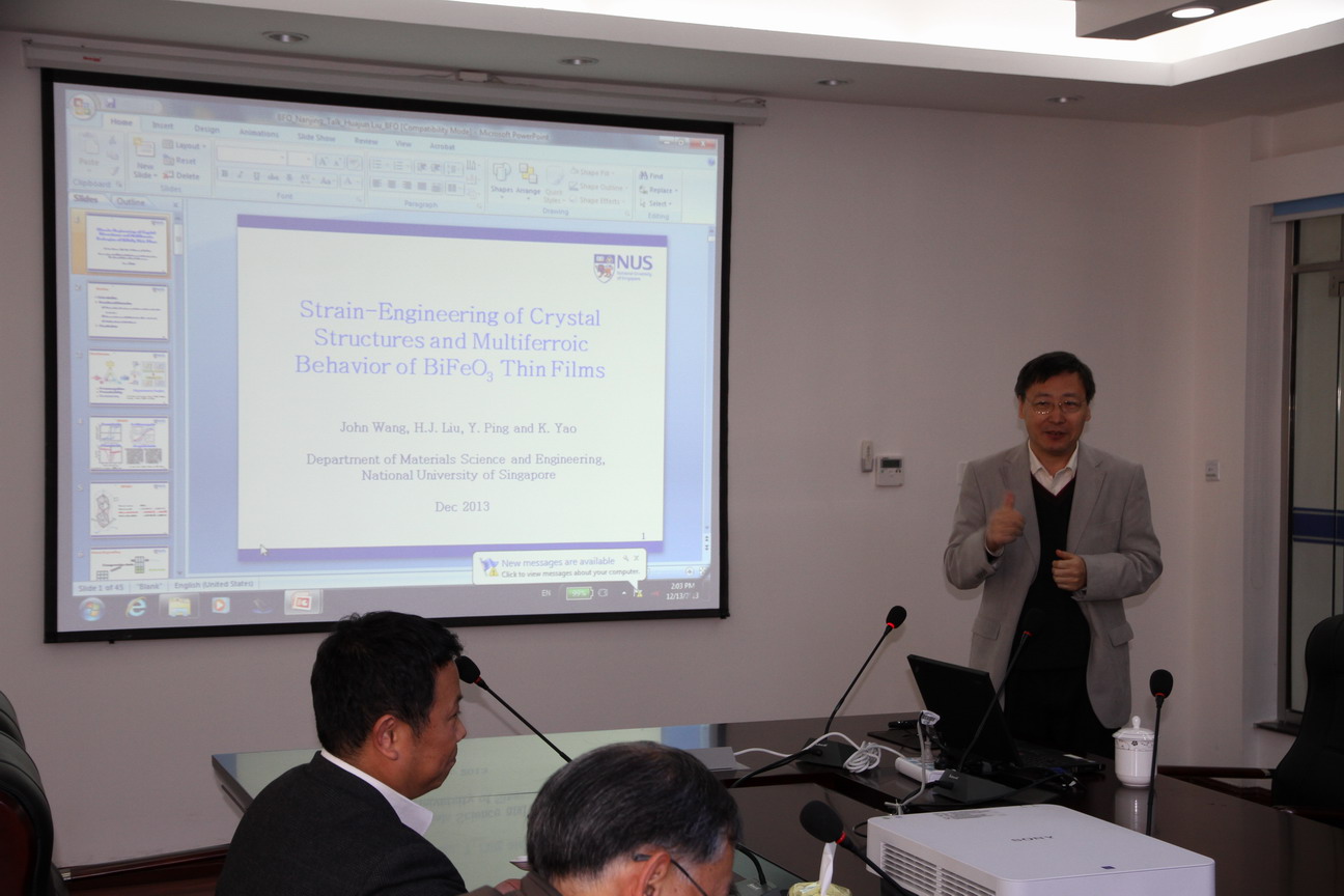 访问期间John Wang教授做了题为“Strain-Engineering of Crystal Structures and Multiferroic Behavior of BiFeO3 Thin Films”的学术报告。报告介绍了铁酸铋薄膜的最新进展,并讨论了在铁电、压电以及能源材料等领域的合作交流等。报告结束后,现场老师和学生就报告内容进行了积极讨论。John Wang教授还参观了还参观了我校“机械结构力学及控制”国家重点实验室。