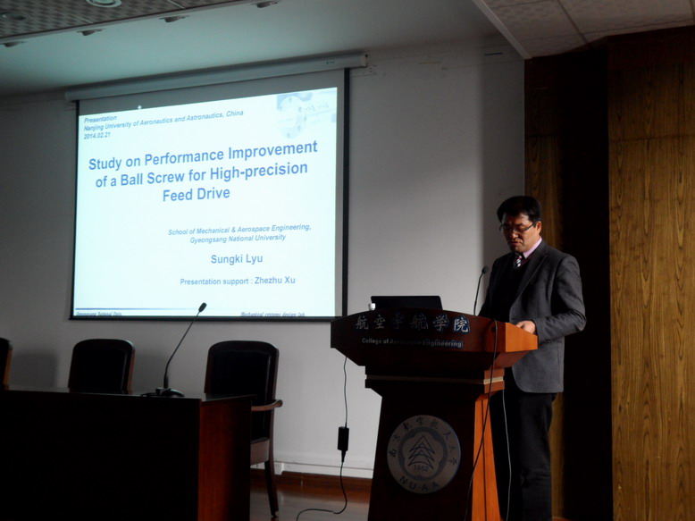 访问期间,Sungki Lyu教授做了题为“对一种高精度进给驱动滚珠丝杠性能改进的研究”的学术报告。黄卫清教授主持了报告会。Yeong-Yil Yang教授以及我校师生近百人参加了学术报告。会上,Sungki Lyu教授就热误差补偿法和热发电控制法在降低加工产热,提高加工精度方面的优势做了详细的阐述,报告现场Sungki Lyu教授与师生就报告内容进行了热烈的交流和讨论。