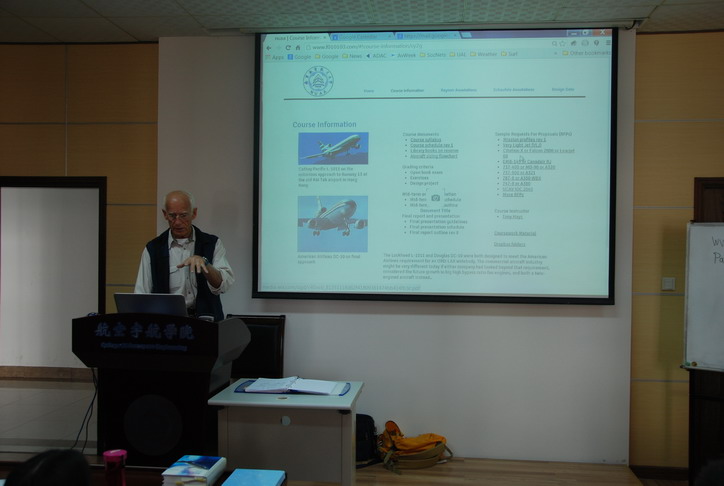 应我校航空宇航学院朱春玲教授邀请,美国加州州立大学长滩分校ANTHONY P. HAYS先生于2014年3月3日至5月2日来我校进行了学术访问。访问期间,讲授了为期两个月的“飞行器总体设计”课程,分别就飞机总体参数设计、总体布局和总体布置、气动、重量和性能估算等问题做了详细的阐述。