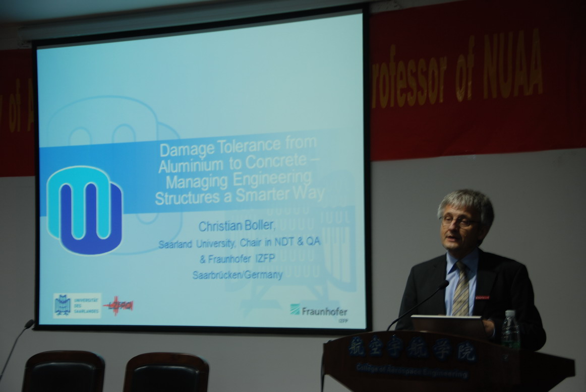 博勒教授现任弗劳恩霍夫无损检测研究所(Fraunhofer IZFP)主任,德国萨尔大学教授,曾任EADS军用飞机结构与机电一体化中心航空结构首席工程师。他所领导的团队是国际上专门从事无损检测、结构健康监测与预测的顶级研究团队,先后发表SCI收录文章近300余篇。近5年,团队承担了欧盟、德国自然科学基金、德国科学技术部、德国经济部以及公司的多个重要项目。他本人也是无损检测、结构健康监测技术及系统研发的开拓者和领先研究者,并于2009年获得国际结构健康监测终身成就将,是结构健康监测领域顶级期刊Structural Health Monitoring主编,是Smart Structures and Materials、J. of Composites Science and Technology、 J. of Composite Mechanics等著名期刊的编辑。