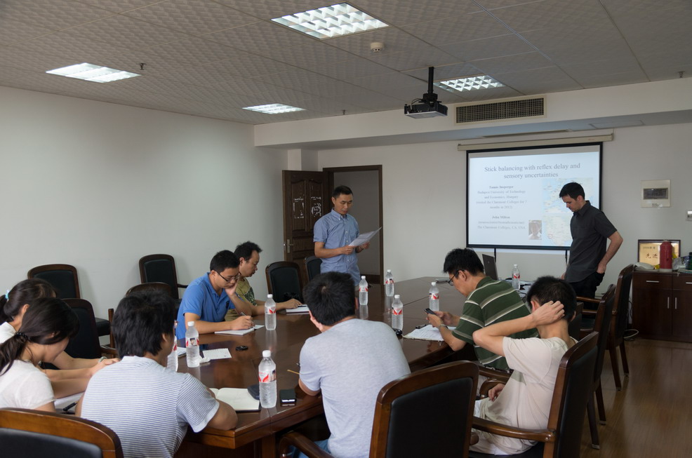 访问期间,Tamas Insperger教授为我校师生做了题为“Stick balancing with reflex delay and sensory uncertainties”的学术报告。报告内容涉及木棍平衡系统在具有大脑反射时滞和传感器不确定性下的平衡控制问题。重点讨论了PD控制、PDA控制、MP控制等五种不同的控制方法,并作了深入的比较,最后得到了在低百分比不确定性时MP控制较好,在高百分比不确定性时PDA控制较好的结论。讲学结束后,Tamas Insperger教授参观了我校机械结构力学及控制国家重点实验室,同王在华教授课题组就共同关注的研究问题进行了深入的探讨和交流。