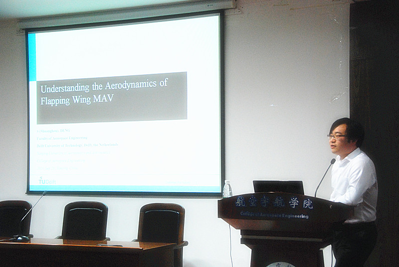 访问期间,邓双厚博士为我校师生做了题为“Understanding the Aerodynamics of Flapping Wing Micro Air Vehicle”的学术报告。报告内容包括先进风洞试验技术、扑翼非定常空气动力最新研究进展与成果等。报告结束后,荷兰代尔夫特理工大学航空宇航学院邓双厚博士还与与会师生开展了深入的讨论,双方获益匪浅。