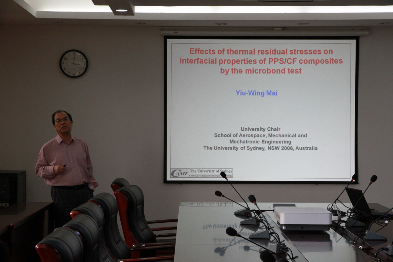 应我校机械结构力学及控制国家重点实验室高存法教授邀请,澳大利亚联邦杰出学者、澳大利亚科学院和工程院两院院士、英国皇家学会两院院士、我校名誉教授Yiu-Wing Mai(米耀荣)教授于2016年4月4日至8日访问了我校,并于4月5日为我校师生做题为“Re-examination of thermal residual stress effects on interfacial properties of thermoplastic matrix micro-bond test”的学术报告。报告内容丰富、生动、精彩,综述了热残余应力对复合材料界面性质的影响,对我校相关科研工作具有借鉴作用。同时,米耀荣院士还结合自己多年的研究经历,讲述了在科学研究中需注意的若干问题。航空宇航学院副院长沈星教授主持了此次报告。