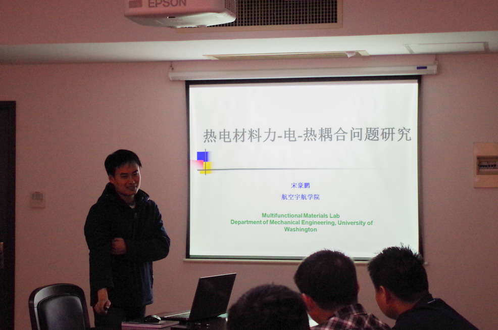 宋豪鹏副教授作为国家公派高级研究学者及访问学者,于2015年3月至2016年3月访问美国华盛顿大学(西雅图)(University of Washington),师从华盛顿大学机械工程系李江宇教授,其主要从事铁电材料、热电材料研究,2004年获美国机械工程协会智能材料与结构2003年度最佳论文奖,2003年度内布拉斯加大学研究成就奖,是本年度内唯一获奖人,也是该奖设立以来最年轻的获奖人。2008年获ICCES卓越青年理论研究者奖以及SiaNamat-Nasser 早期职业生涯奖。主持美国自科基金项目,美国陆军研究项目,美国化学学会石油研究基金项目,内布拉斯加研究基金项目等,研究经费超过400万美元。发表SCI 论文120余篇,引用2700余次。现任《Journal of Applied Physics》副主编。