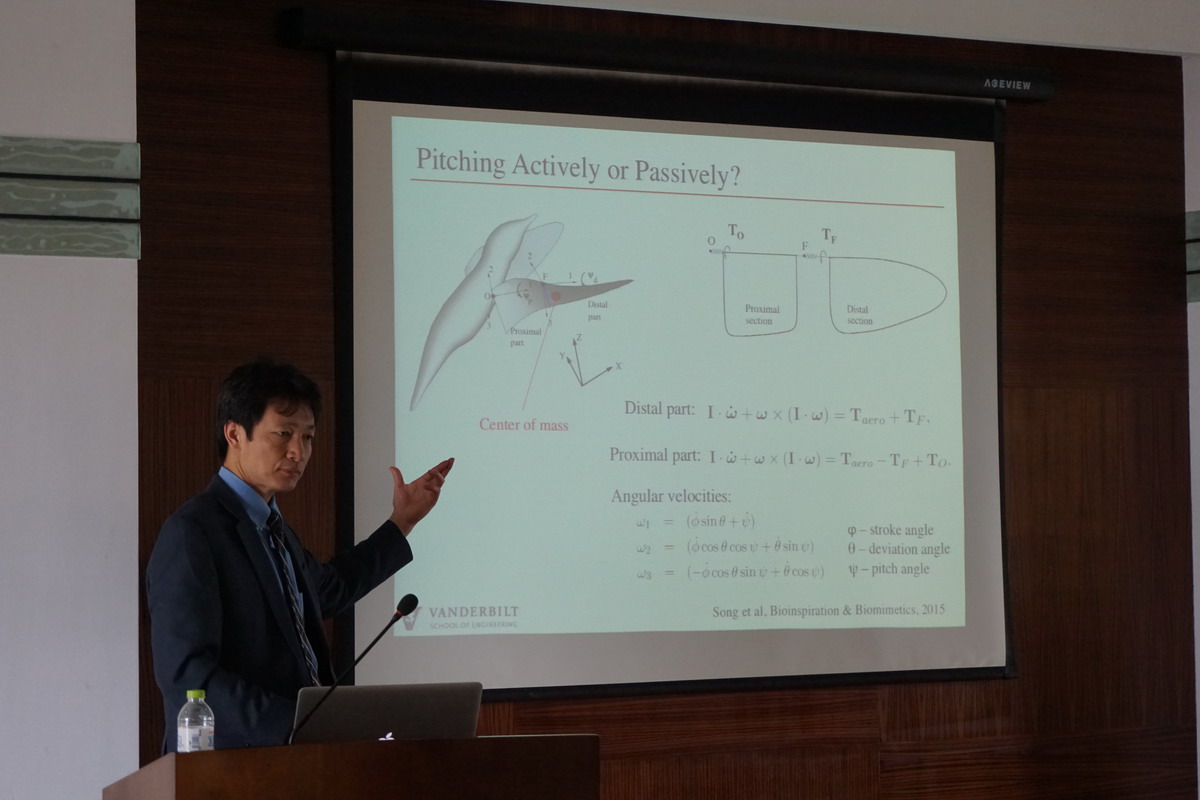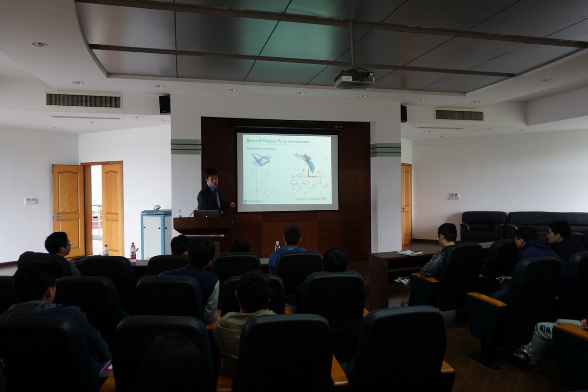 应我校航空宇航学院空气动力学系周春华教授邀请,美国范德堡大学机械工程系Haoxiang Luo副教授于2016年4月27日至28日访问了我校,并于4月27日为我校师生做了题为“Recent lessons from the wings of nature”的学术报告。Luo副教授阐述了鸟和昆虫飞行的空气动力学和弹性力学机理、对飞行器设计的启发,以及其团队在该领域的最新研究成果。报告内容丰富、精彩,对我校相关科研工作具有借鉴作用,参加报告会的师生受益匪浅。同时, Luo副教授还结合自己多年的研究经历,讲述了科学研究的思维、方法和一般规律等若干问题。周春华教授主持了此次报告会。