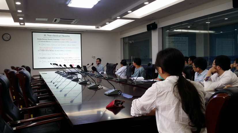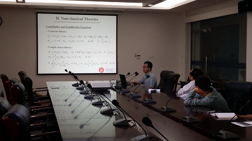 应我校机械结构力学及控制国家重点实验室钱征华教授邀请,美国南卫理公会大学鲍比莱尔工程学院 Xin-Lin Gao教授于2016年5月23日至25日访问了我校,并于5月24日为我校师生做题为“Modeling Size Effects at Small Length Scales Using Higher-Order and Surface Elasticity Theories”的学术报告。报告内容丰富、生动、精彩,介绍了适合分析尺寸效应或者表面能影响的两种高阶弹性理论和一种表面弹性理论及其分别在梁、板等简单结构方面的应用。对我校相关科研工作具有借鉴作用。同时,还结合自己多年的研究经历,讲述了如何在基础研究上进行创新性工作等若干问题。钱征华教授主持了此次报告会。