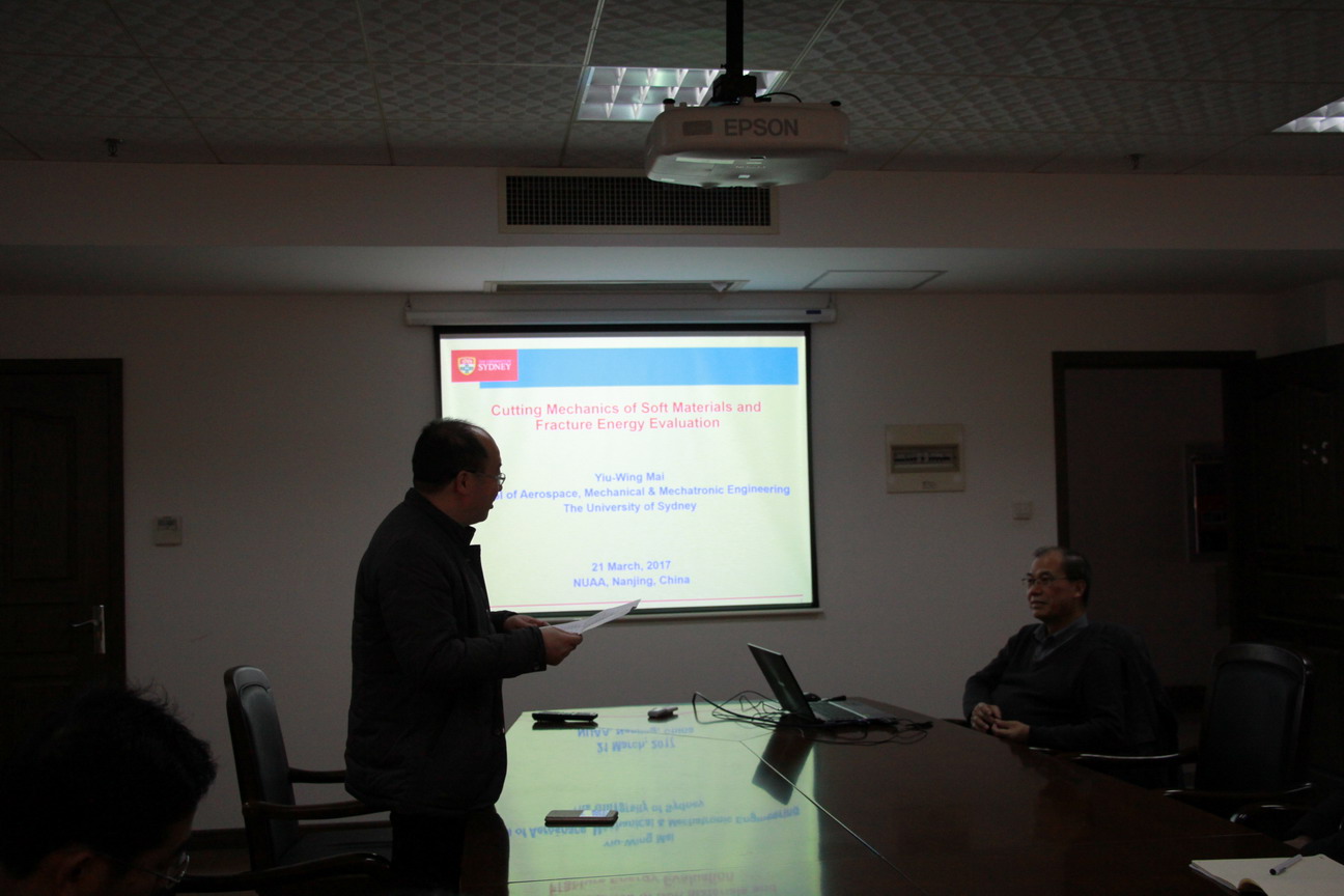应我校机械结构力学及控制国家重点实验室高存法教授邀请,我校名誉教授、澳大利亚联邦杰出学者、澳大利亚科学院和工程院两院院士、英国皇家科学院和工程院两院院士、澳大利亚悉尼大学航空航天与机械机电工程学院Yiu-Wing Mai(米耀荣)教授及Hong-Yuan Liu博士于2017年3月20日至30日访问了我校,并分别于3月21日、3月29日为我校师生做题为“Cutting Mechanics of Soft Materials � The Role of Fracture Toughness”及“Carbon fibre/epoxy composites toughening by interleaves”的学术报告。报告内容丰富、生动、精彩,分别介绍了断裂韧性在软物质切割力学中的作用及在聚合物复合材料加工制造中的应用,以及采用短纤维薄膜、碳纳米管薄膜等增韧层对碳纤维复合材料结构进行增韧以提高其层间断裂韧性的研究进展,对我校相关科研工作具有非常大的借鉴作用。王立峰教授主持了报告。