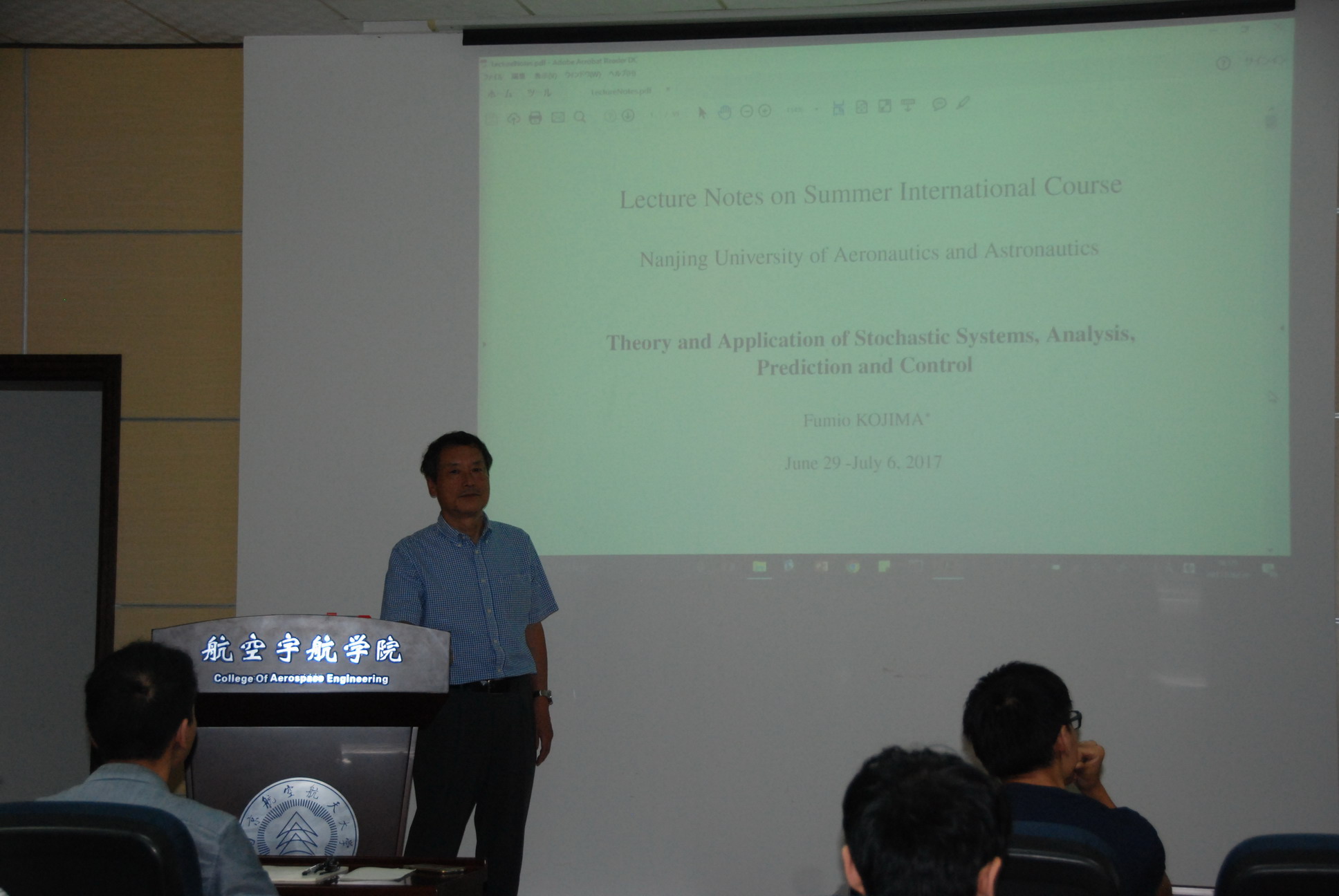 应我校航空宇航学院机械结构力学及控制国家重点实验室裘进浩教授邀请,日本神户大学名誉教授Fumio Kojima教授,于2017年6月29日至7月8日访问了我校,并于6月29日至7月6日为我校研究生讲授了题为“Theory and Application of Stochastic Systems � Analysis, Prediction and Control”的国际课程。课程内容丰富、生动、精彩,介绍了随机系统的辨识、优化及控制方法,对我校相关科研工作具有借鉴作用。同时,Fumio Kojima教授还结合自己多年的研究经历,讲述了随机系统的相关理论在石油勘探、航天器天线的结构分析等领域的应用。裘进浩教授主持了此次报告会。