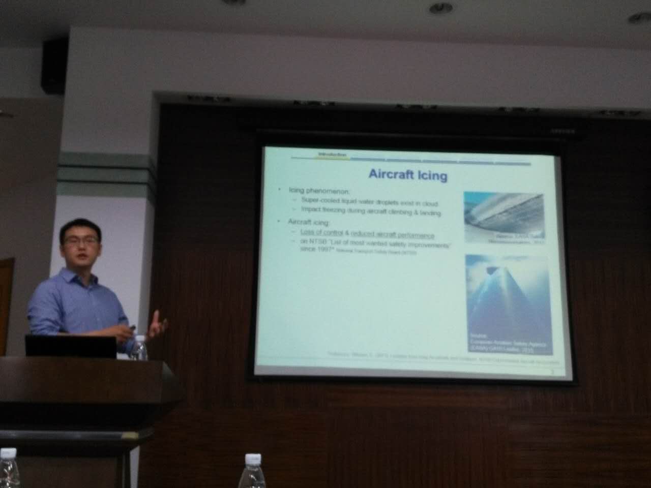 应我校人机与环境工程系朱春玲教授邀请,美国克莱姆森大学老师Yiqiang Han博士于2017年6月28日至30日访问了我校,并于6月30日为我校师生做了题为“Thermal Physics of Aircraft Ice Accretion”的学术报告。报告内容丰富、生动、精彩,介绍了材料表面结冰热力学建模研究工作,对我校相关科研工作具有借鉴作用。同时,Han 博士还结合自己多年的研究经历,讲述了旋翼桨叶、风力机叶片结冰等问题的相关工作。朱春玲教授主持了此次报告会。