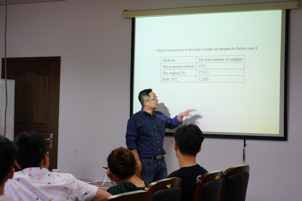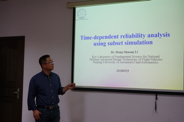 按照校人事处对公派留学回国教师的要求,航空宇航学院飞行器先进设计技术国防重点学科实验室李洪双副教授于2018年5月15日为我校师生做了题为“Time-dependent reliability analysis using subset simulation”的学术报告。报告主要介绍了其在美国密苏里科技大学访问期间所开展的结构机构动态可靠度评估和不确定性优化设计等方面的研究进展。