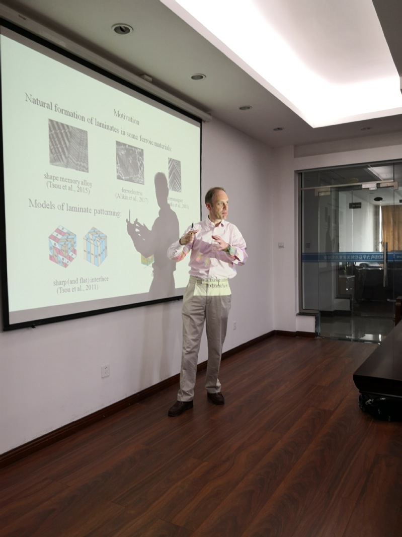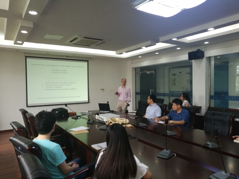 应我校航空宇航学院机械结构力学及控制国家重点实验室高存法教授的邀请,牛津大学John Huber教授于2018年9月3日至2018年9月7日访问我校,并于9月3日和9月7日分别做了题为Laminate theory and application of elasto-magneto-electric materials:Theory和Laminate theory and application of elasto-magneto-electric materials:Application的学术报告。报告从理论层面上通过讨论铁电材料中的微观结构来推动对层压板的研究,并展示了如何使用经典的均质化理论推导出层压板的线性特性,又从应用角度探讨了形成具有所需弹性或电磁耦合特性的材料的一些可能性。报告内容丰富、生动精彩,对我校相关研究有一定的借鉴作用。讲座后,Huber教授认真回答了师生的提问,并与在场听众关于科学研究和留学等话题进行了探讨和交流。师岩副研究员主持了报告。