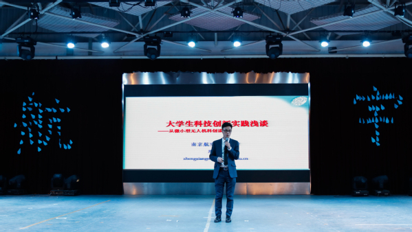 青春飞扬的舞台上,一首由航宇学子原创的航宇青年主打歌《逐梦长空》拉开了师生同乐跨年的序幕。此次梦想公开课分为“航宇青年知”、“航宇青年行”、“航宇青年梦”三个篇章,启迪着航宇新青年在新的一年中继续践行爱国、励志、求真、力行。第一篇章“航宇青年知”中,2018级入党积极分子带来朗诵《祖国颂》,抒发了航宇青年的家国情怀;合唱《我们都是航宇人》展现着航宇青年航空报国的志向和坚强不屈的意志;话剧《灰姑娘的南航奇遇记》启发同学们在大学中笑对生活起落、关注心理健康;研究生院副院长、航空宇航学院飞行器系副教授郑祥明老师则为同学们讲述科创故事,从微小型无人机的角度带来了创新与实践的精彩一课。第二篇章“航宇青年行”以团委“微心愿”活动与“绿勤行”社会实践团队的分享为开端,向同学们诉说着2018年暑期实践中的精彩故事;民族舞蹈《维吾尔风情》展现着民族大团结、共创新时代的航宇青年追求。第三篇章“航宇青年梦”中,航宇学子以引爆全场的舞蹈串烧跳出了青春梦的活力色彩与热情澎湃;话剧《月桂女神》鼓舞同学们青春逐梦最重要的是过程和体验,要不怕失败,勇敢向前;而互动合唱《We will rock you》展现出了航宇青年拼搏向上的逐梦信念,再次引发全场学子共鸣。在教师致辞环节,每位到场老师逐一向航宇青年表达了殷切嘱托与新年祝福,随后通过向同学们放飞写有新年寄语的纸飞机,将最真挚的祝福与期盼传递到同学手中,再一次将晚会推向高潮。