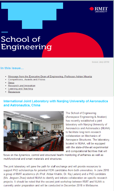 澳大利亚皇家墨尔本理工大学工程学院时事通讯2018年7月刊报道了“航空航天结构力学”国际合作联合实验室的共建情况。