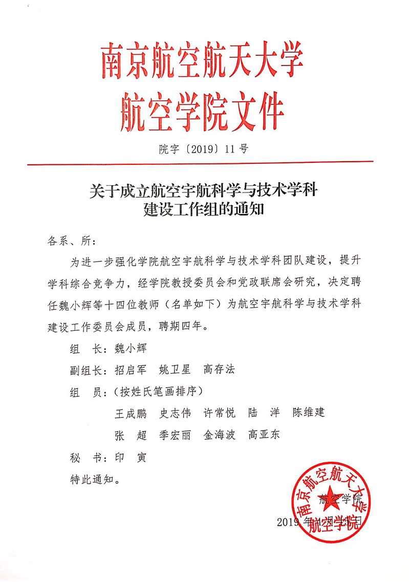院字[2019]11号 关于成立航空宇航科学与技术学科建设工作组的通知