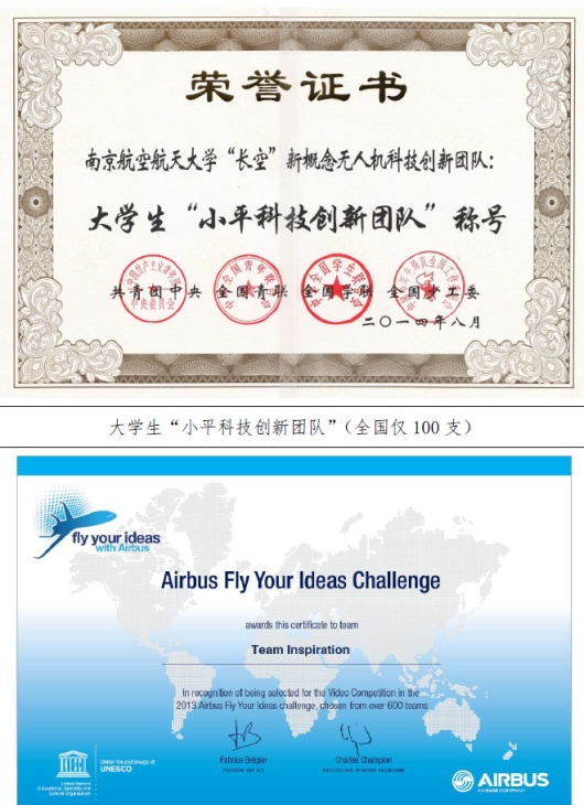2014年,本科生“长空”团队荣获首届大学生“小平科技创新团队”,这是全国青少年科技创新最高奖励。该团队完成了数十架无人机的创新设计,发表学术论文13篇,获“挑战杯”特等奖、一等奖、中航工业杯国际无人飞行器创新大奖赛创意组特等奖等国家级创新竞赛奖21项。