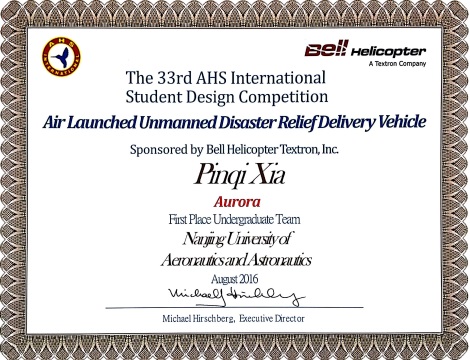 2016年,本科生“曙光”团队设计的“遥控救灾无人旋翼飞行器”荣获美国直升机学会第33届世界大学生旋翼飞行器设计竞赛第一名,这是第一次由非美国的参赛团队获得第一名,获得第二、第三名的是世界直升机研究最强的大学佐治亚理工学院和马里兰大学。这项竞赛是世界直升机领域水平最高、难度最大、专业最强的世界大学生设计竞赛。