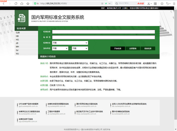 系统介绍:国内军用标准全文服务系统收录国内航空行业、机械行业、化工行业、兵器行业、军用领域等方面的标准文献,能完整揭示国内军用科学、技术和实践的总结性成果,对相关行业领域的发展起到极大的促进作用,最大限度地满足客户对国内军用标准文献信息的需求,是国内先进、科学、完整的标准全文数据库系统。