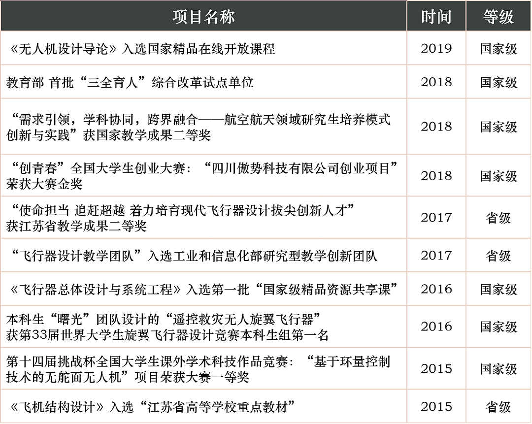 (3)以学生为中心,全面落实三全育人:1)健全班主任和学业导师制度,加强全过程培养;2)建立拔尖创新人才培养机制,实行精英培养;3)加强飞行器设计创造学课程,培养创新能力和意识;4)完善“总师制”团队毕业设计模式,训练和提升学生的“三能力”和“三素质”;5)设立创新训练项目,组织创新设计竞赛;6)开放科研项目,吸收学生参与科学研究;7)建立学生主题创新实验室和主题创新区。