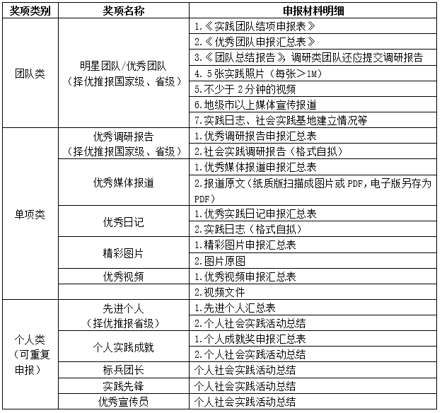 有意向参与社会实践评优的团队或个人可根据各自实践类型提交相应文件,奖项分为团队类、单项类、个人类,具体设置及所需申报材料见下表,材料模板详见文件夹《评选先进典型相关附件》,参与团队实践的个人也可申报个人类奖项。