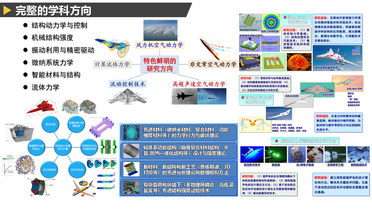 本专业面向航空、航天、国防科技、高新技术等领域涉及的重大力学问题,在结构动力学与控制、机械结构强度、振动利用与精密驱动、微纳系统力学、智能材料与结构等研究方向具有重要地位和广泛的学术影响。遵循“宽口径、厚基础、强能力、高素质”的培养模式,通过力学、数学、机械、信息、控制等多学科交叉融合,培养的学生能在航空、航天、先进制造、交通运输、海洋产业等高新技术领域,以及高等院校、政府企业事业机构等从事技术研发、科学研究、高级管理、技术咨询等专业工作。