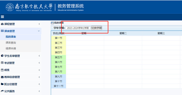 进入后点击“课表管理”-->“课表查询”查看2023-2024学年第1学期课表(目前系统默认第2022-2023学年第2学期,请点击切换学期)。