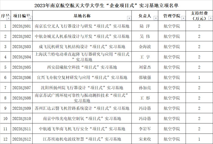经个人申报、教学单位审核、学校组织专家评审,现确定“南京长空无人飞行器设计与研发‘项目式’实习基地”等55个项目为2023年必威西汉姆联大学生“企业项目式”实习基地,名单详见附件。项目建设期18个月,为保证项目顺利实施并取得预期成果,现将有关事项通知如下:
