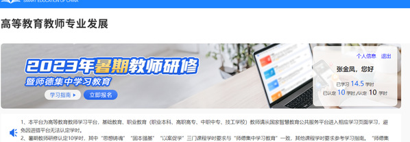 即日起至8月31日,教师通过国家智慧教育公共服务平台(www.smartedu.cn)进入“2023年暑期教师研修”专题,实名注册后自主选学、完成配套测试、获得相应学习时长,专题地址:https://teacher.higher.smartedu.cn/h/subject/teaching/。
