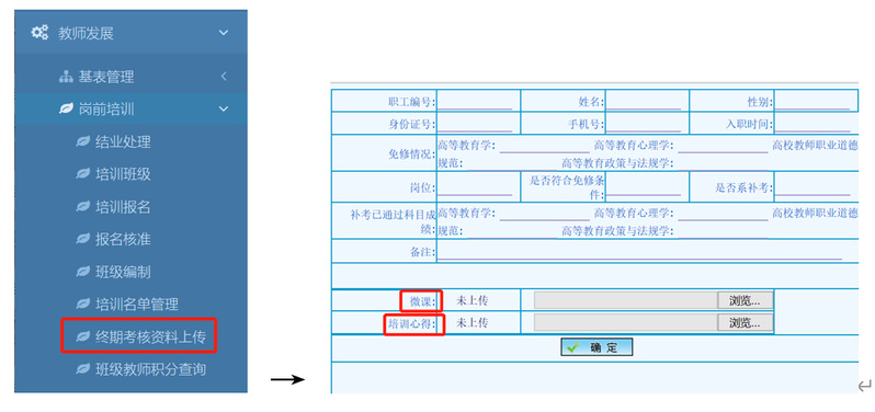 1.参训教师于2023年9月17日前登录“教发培训服务平台”(http://nwp.nuaa.edu.cn)-“岗前培训”-“终期考核资料上传”,分别完成“微课”和“培训心得”的上传。