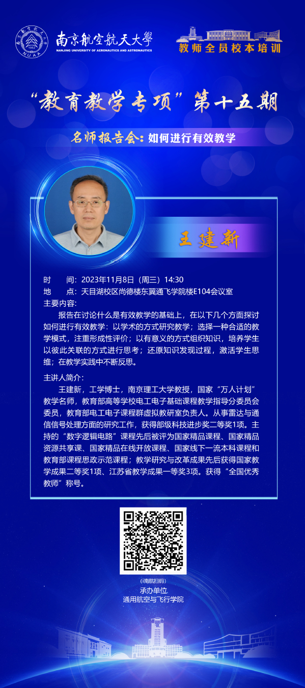 各位老师,通用航空与飞行学院邀请国家“万人计划”教学名师王建新教授开展教师教学能力提升工程之名师讲堂第三期;