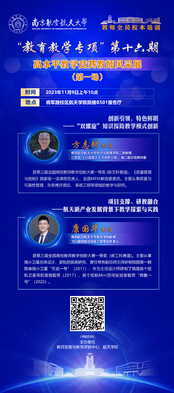 各位老师好,为配合各单位组织开展2023年高水平教师教学竞赛的赛前动员与培训工作,11月起将我校将组织高水平教学竞赛风采展系列活动,拟邀请全国青教赛、教创赛获奖教师为我校作经验分享交流。现将本周四首场活动公布如下: